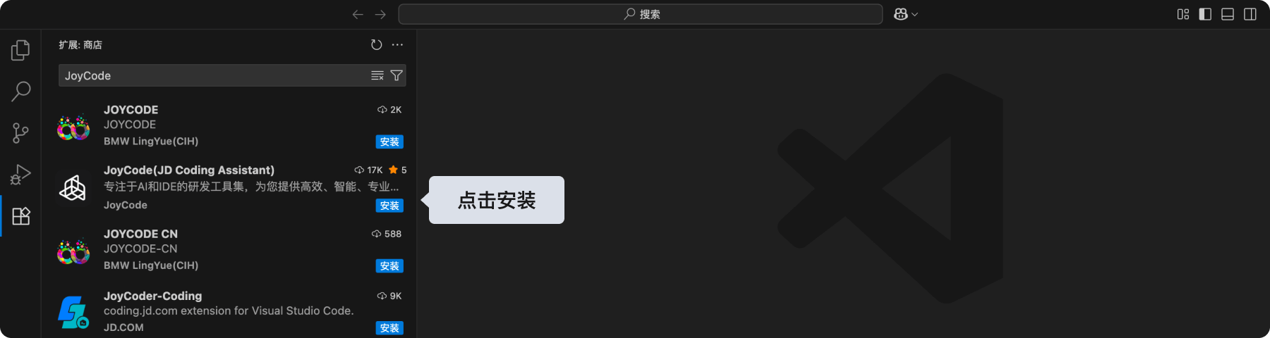 点击左侧边栏“扩展”图标,搜索关键词 “JoyCode”,找到 JoyCode ( JD Coding Assistant ) 插件,点击安装